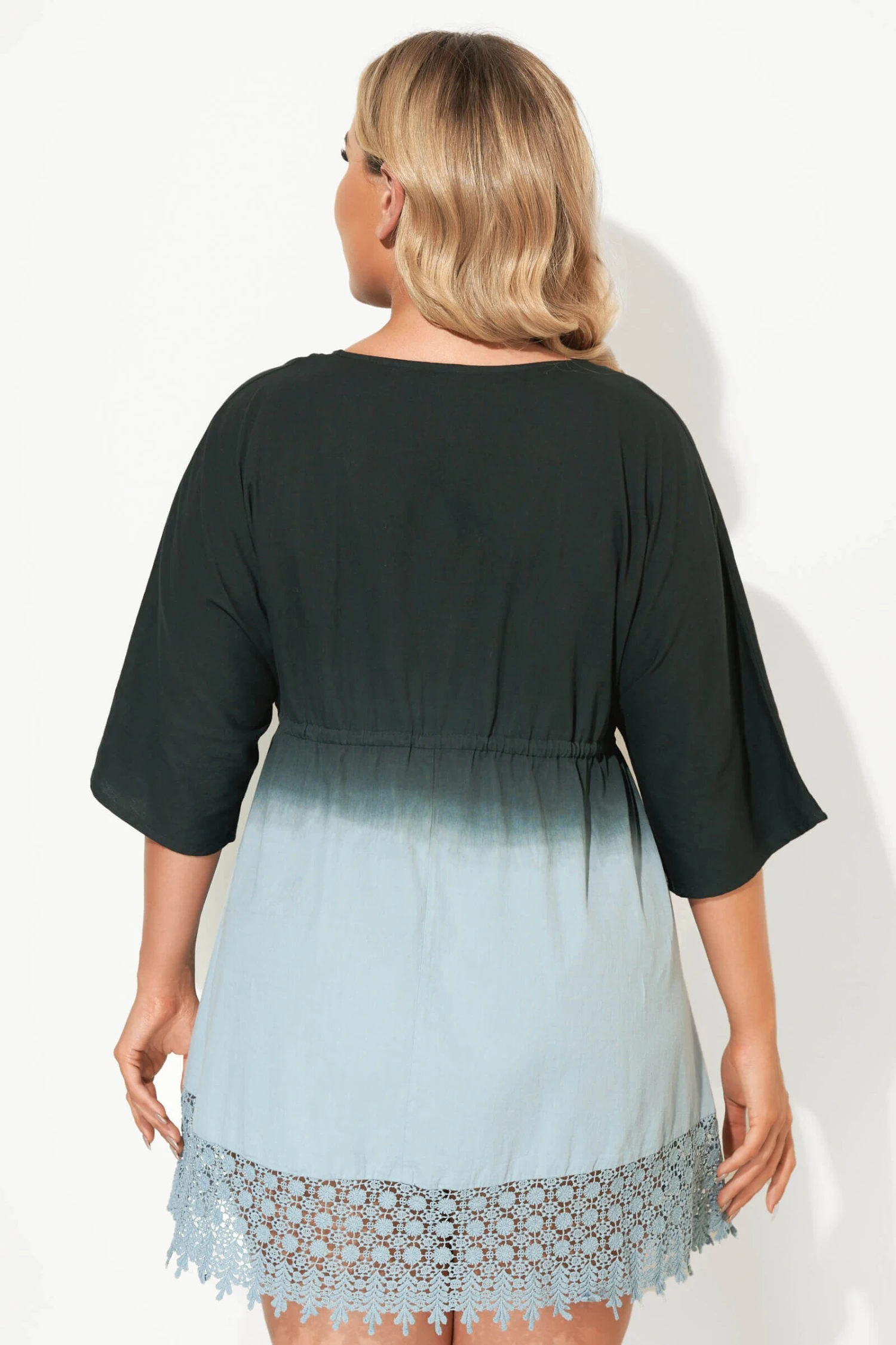 Others: Delicate crochet openwork trim detail. Functional empire drawstring waist. Unique tie-dye print fabric