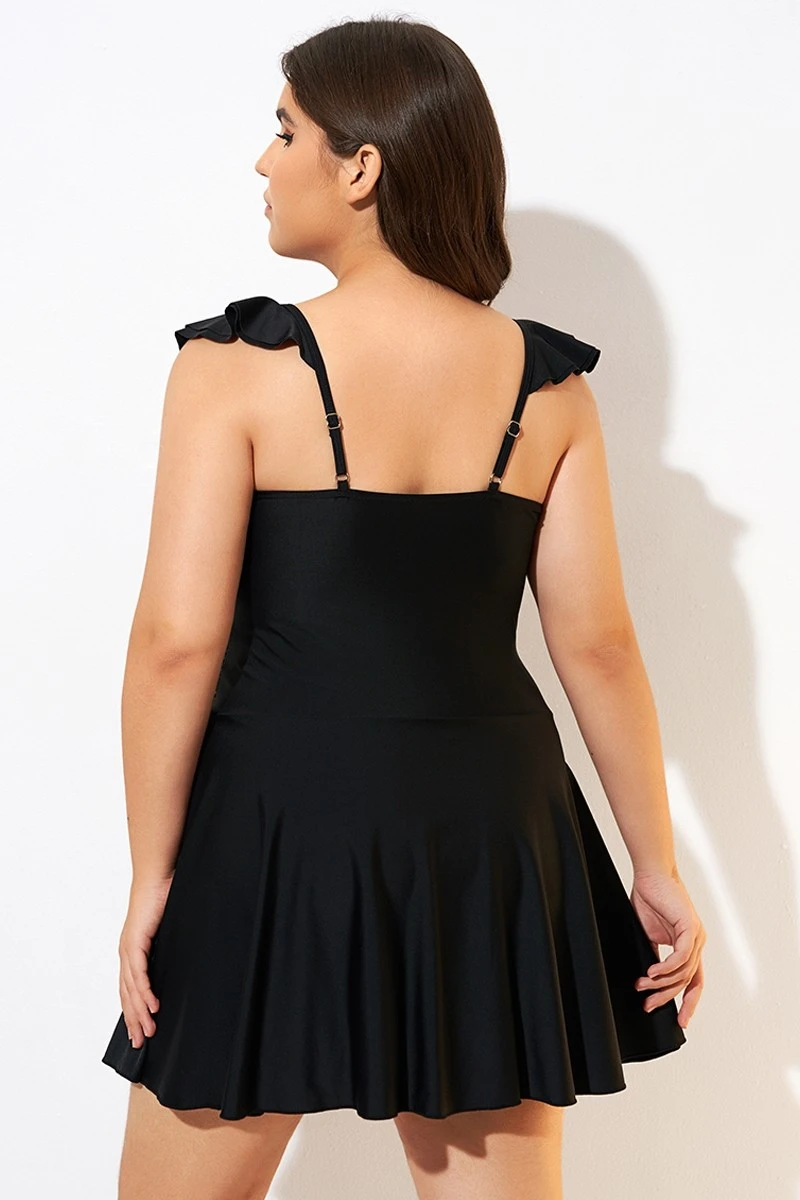 Solid Black Fringe Ruffle Hem Bandeau Swimdress